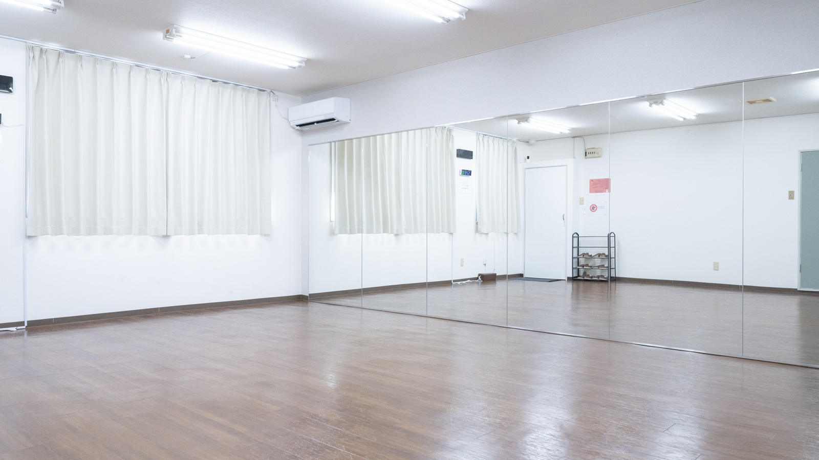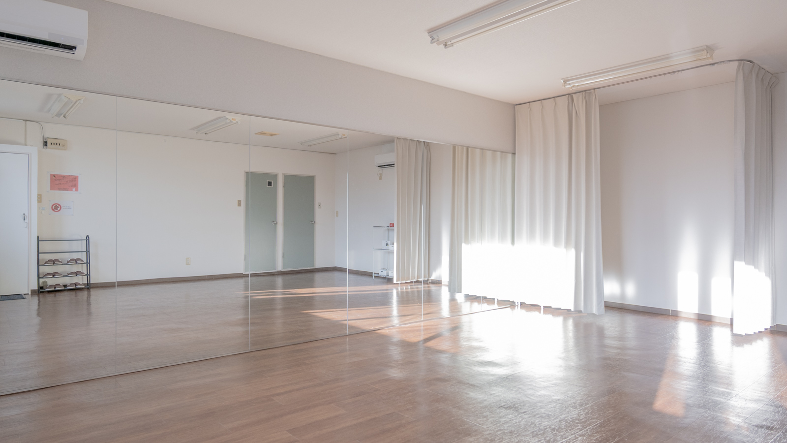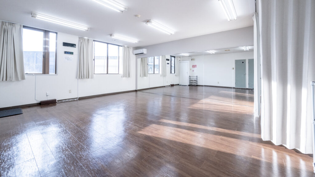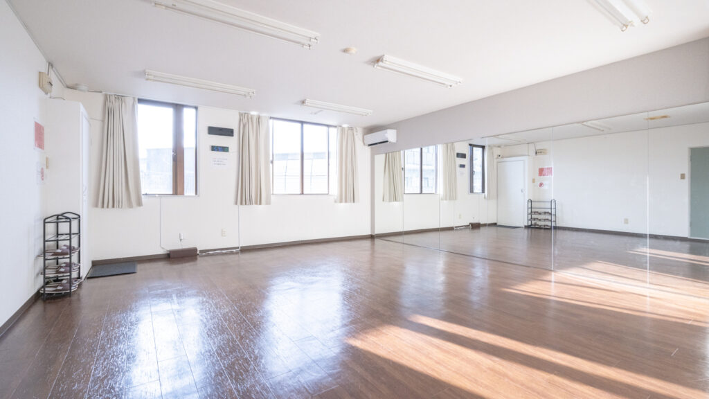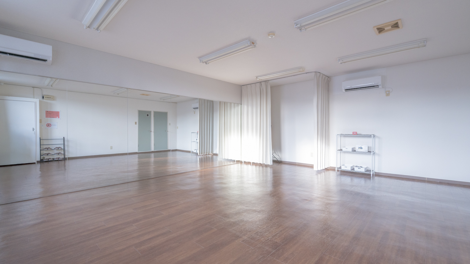 広々とした35㎡のフローリングスペース。最大8名様までご利用いただけ、グループレッスンや個人練習に最適です。