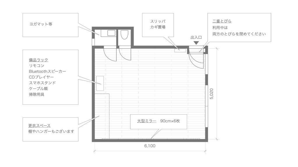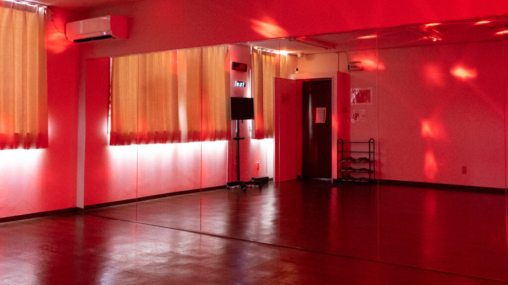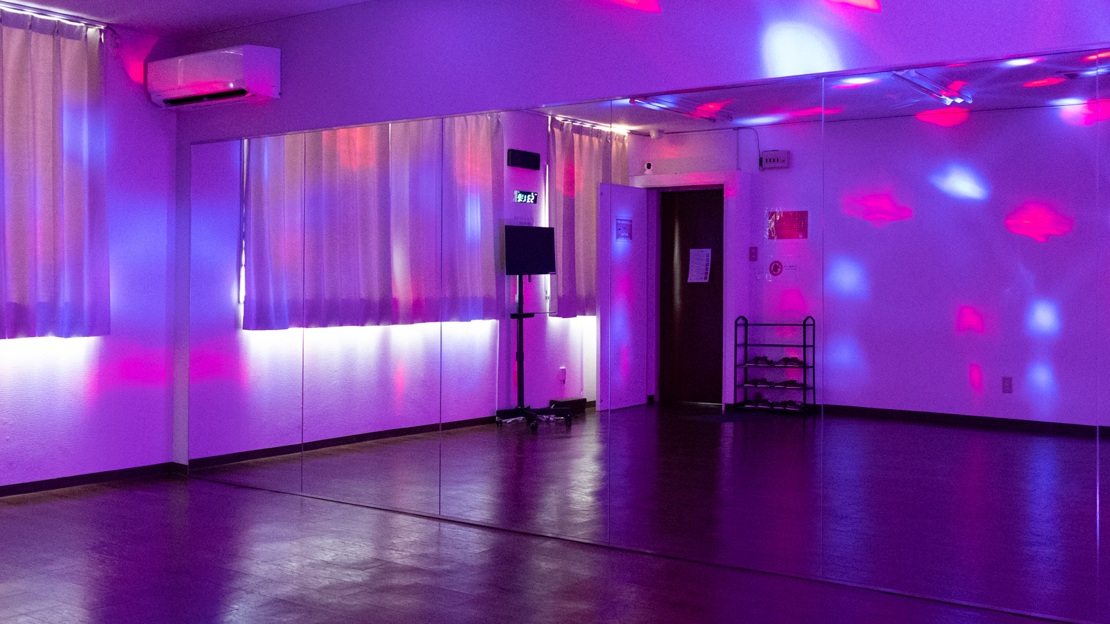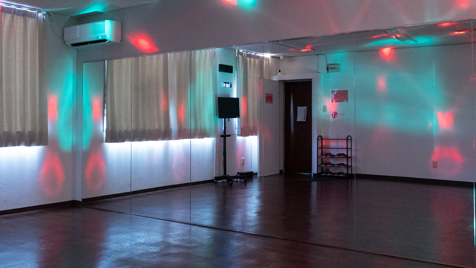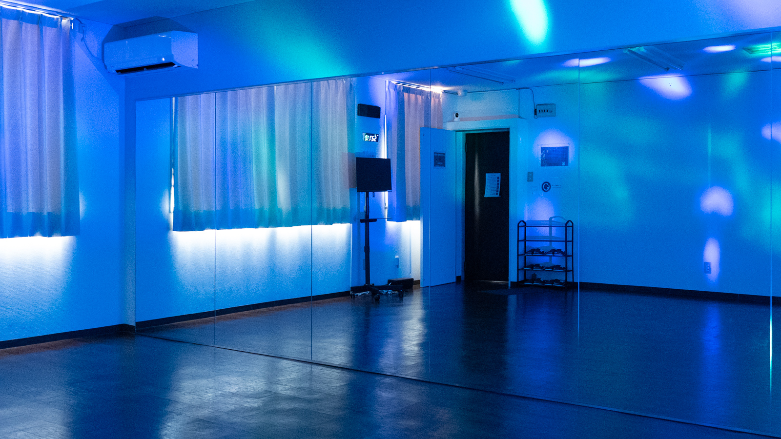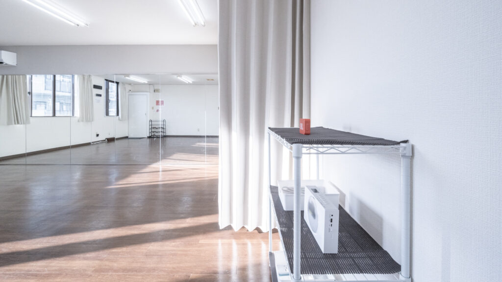 広々とした35㎡のフローリングスペース。最大8名様までご利用いただけ、グループレッスンや個人練習に最適です。