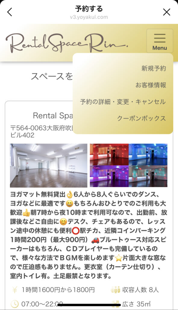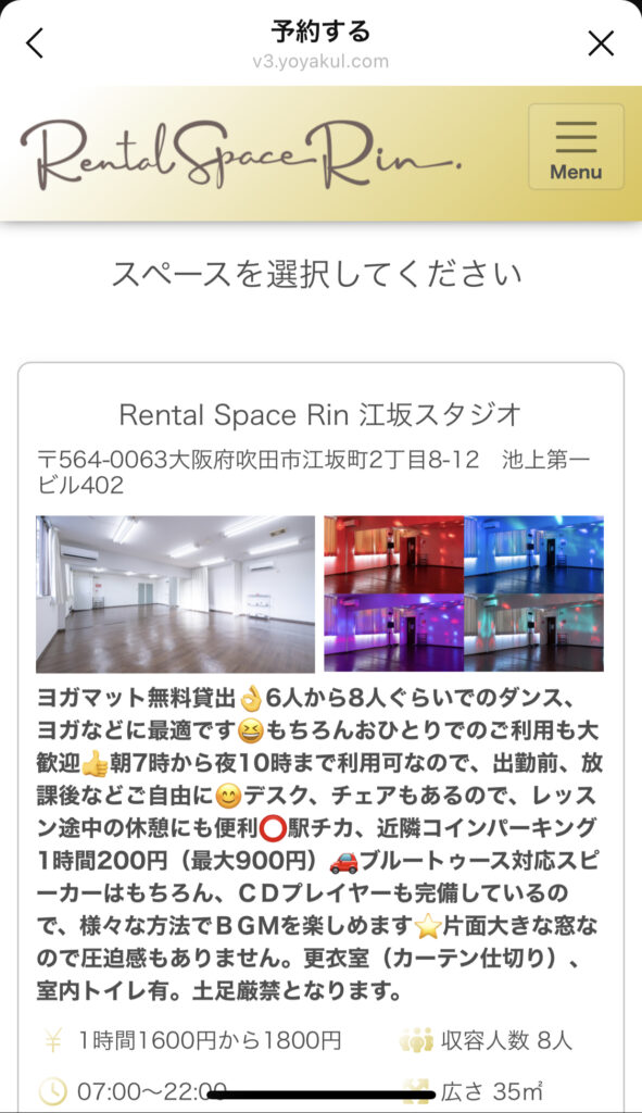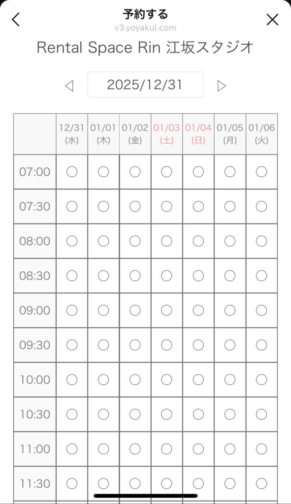 ②予約するスタジオを選び、希望日時に空きがあればその日時を選びます。