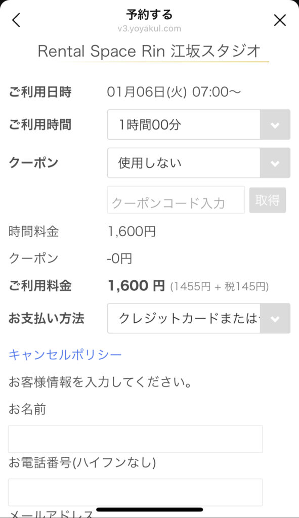 ③お名前・連絡先・クレジット情報を入力し、予約します。